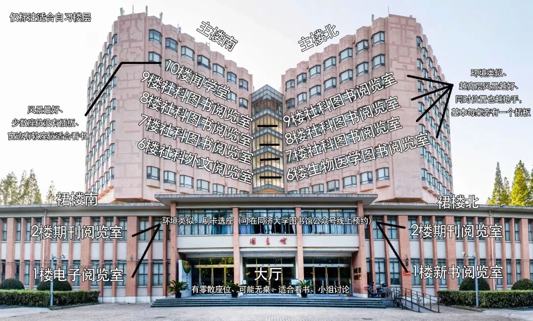 同济大学图书馆提到去哪自习,首先想到的必须是学习气氛最浓郁的地方——图书馆,拥有着多层的可自习区域!!!开放时间7:30-22:30,考试周晚上延长至23:00。每层楼可自习的阅览室都在图里啦,大家可以点击图片放大看详细信息~码起来!