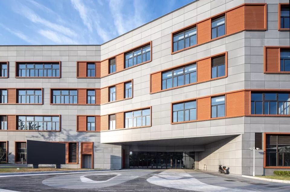 主要立面材料:干挂外立面专用彩色水泥纤维板、装饰铝板、铝合金波纹板、铝合金穿孔铝板等。本工程为预制装配式建筑,预制装配率42%。