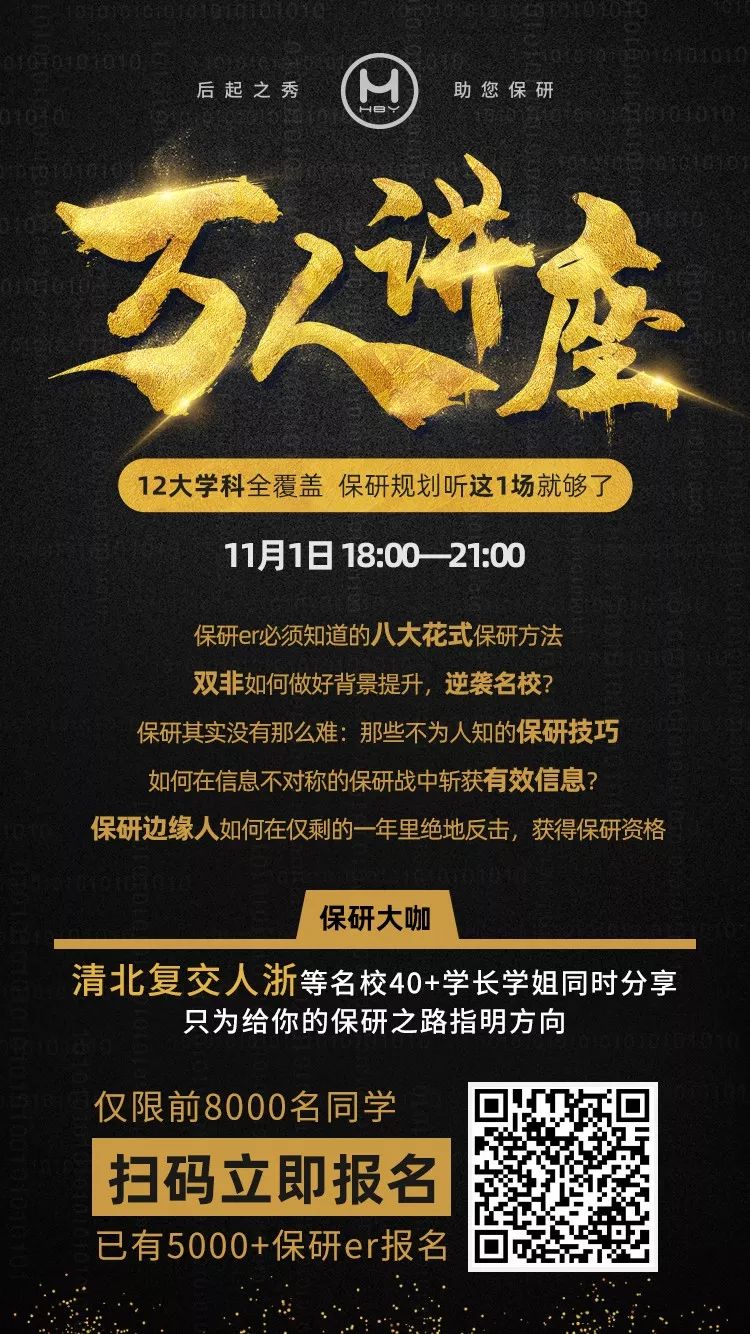 保研是一场艰辛的旅行,如果你选择了保研这条路,请一定要坚信自己!亲爱的保研er们,无论这条路怎样荆棘遍野,无论最终是否结果理想,后保君都会一直在你们身后,默默给予你们帮助。同时,后保研携手清北复交人浙等40+学长学姐的《保研规划——万人讲座》将于11月1日18:00准时开讲!等你来约呦~
