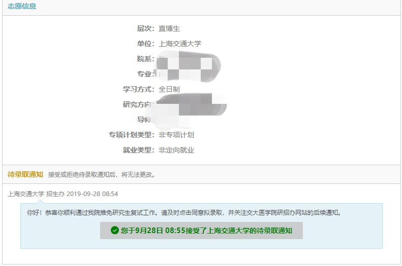 从今年5月份开始制作简历、个人陈述等文书到9月28号接受上交直博的拟录取,挣扎了近5个月的时间,感谢曾经做出的选择,感谢为之付出的努力。