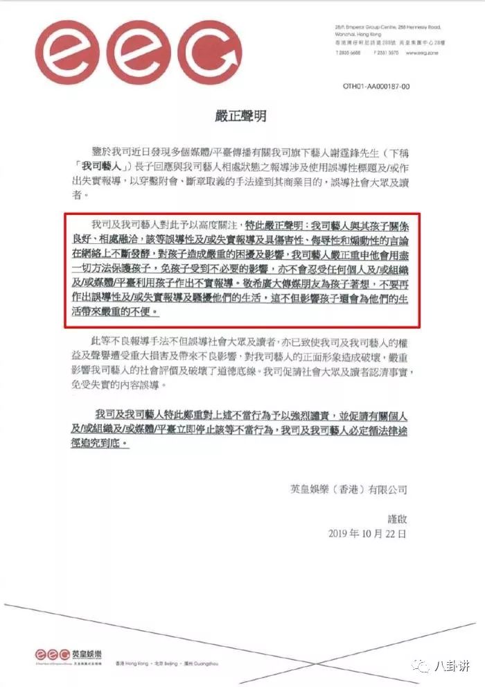 10月22日,霍文希在网上发布了一则声明,回应谢霆锋和儿子们关系不和的消息。