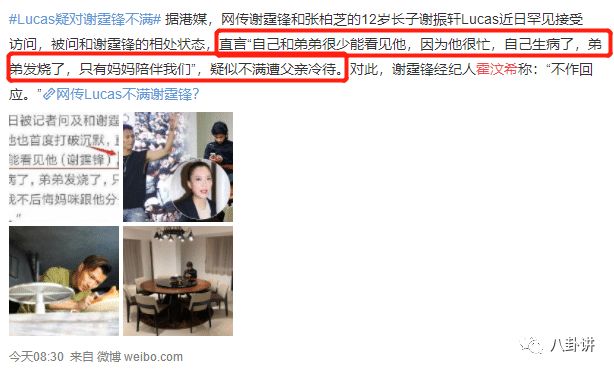 今天,网上有消息称,谢霆锋和塞西莉亚的长子卢卡斯罕见地接受了采访。当被问及与谢霆锋的关系时,报道称,“我和弟弟很少见到他,因为他很忙,他生病了,我弟弟发烧了。只有我妈妈会陪我们。”