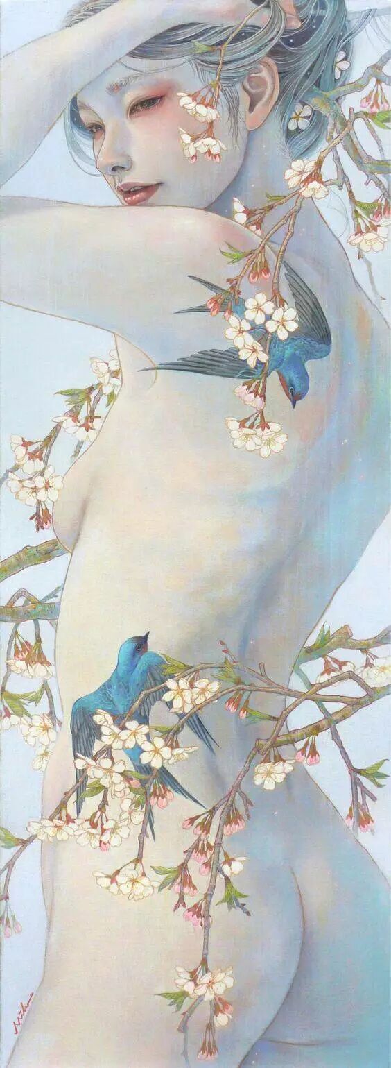小鸟在人物的发梢间穿梭流淌