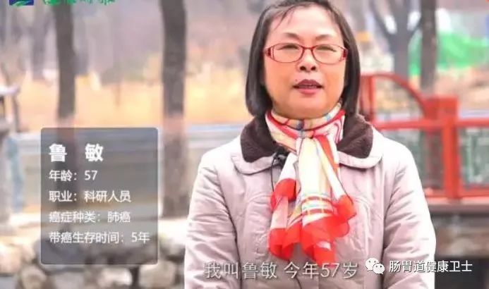 ① 姓名:鲁敏,年龄:57; 职业:科研人员;癌症种类:肺癌 , 带癌生存时间:5年。