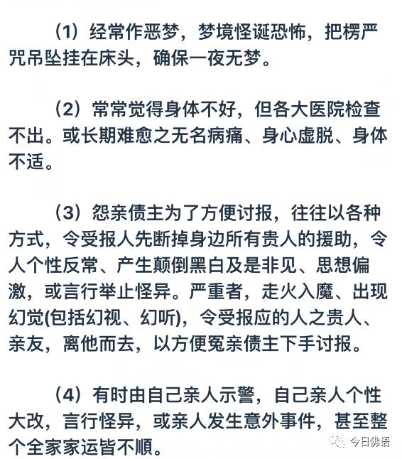 地府有规定,怨亲债主对于善良之人作讨报,必须以下述各种初期征兆做示警,让善良之人有机会事先发觉初期征兆,诚恳多做善事,念诵佩戴楞严咒回向,用念诵佩戴楞严咒的功德来和解业障,而得到消灾解厄。