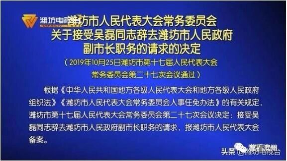 权威发布:吴磊同志辞去潍坊市副市长职务 潍坊电视台报道: 2019年10月25日,潍坊市第十七届人民代表大会常务委员第二十七次会议决定:接受吴磊同志辞去潍坊市人...