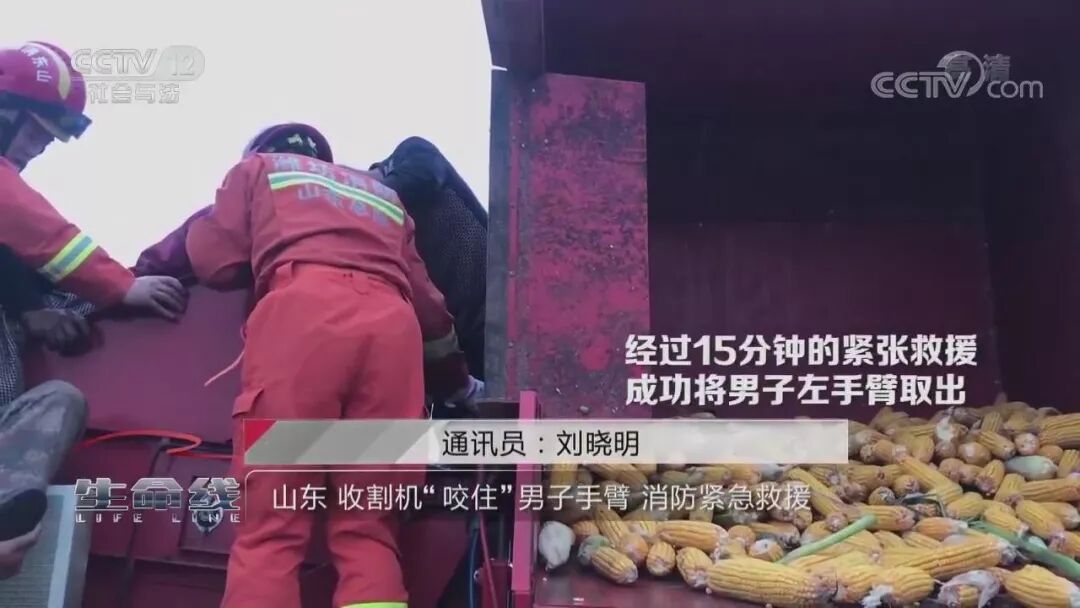 对山东潍坊昌邑消防救援被收割机“咬住”手臂男子的事件进行了报道。