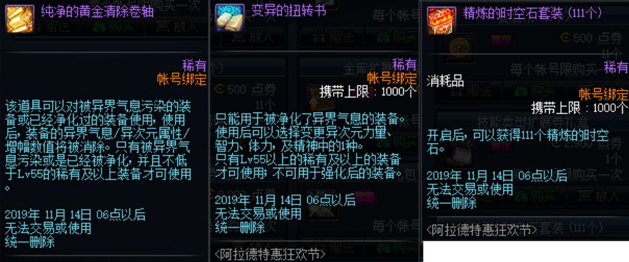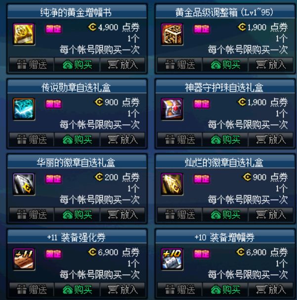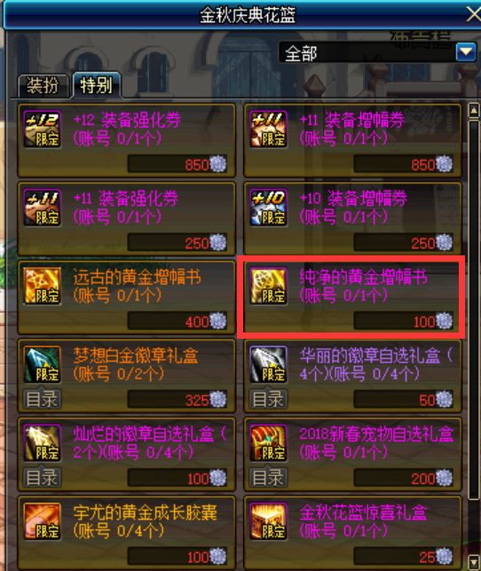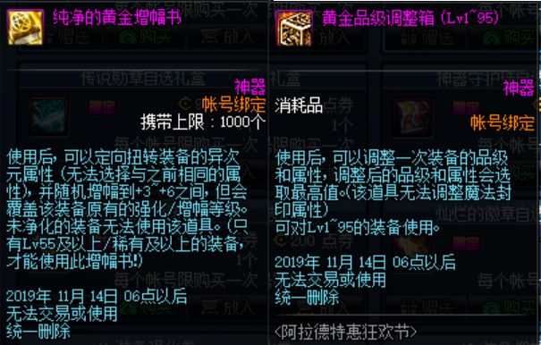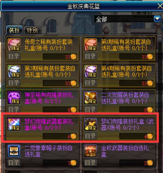 2019年10月31日维护后,梦幻克隆武器装扮套装礼盒/梦幻克隆装扮礼盒购买上限+1,特别商店内新增纯净的黄金增幅书。