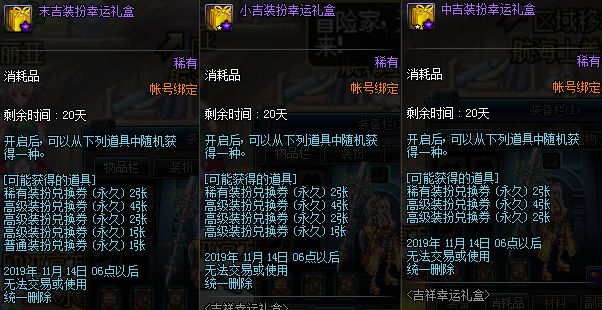 暂时没有大吉装扮礼盒图片,但根据其他大吉礼盒猜测,里面道具应该是随机获得2张天空券或4张高级时装券。