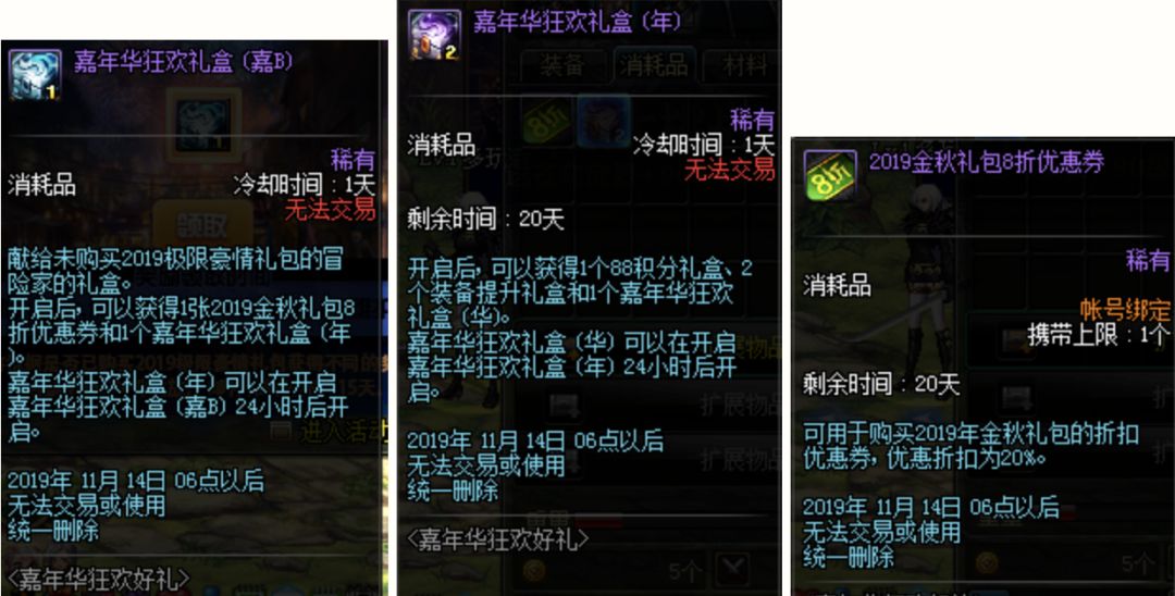 部分重要奖励:2019金秋礼包9折券、2019金秋礼包8折券、金秋花篮特别凭证、金秋花篮装扮凭证、88积分、装备提升礼盒