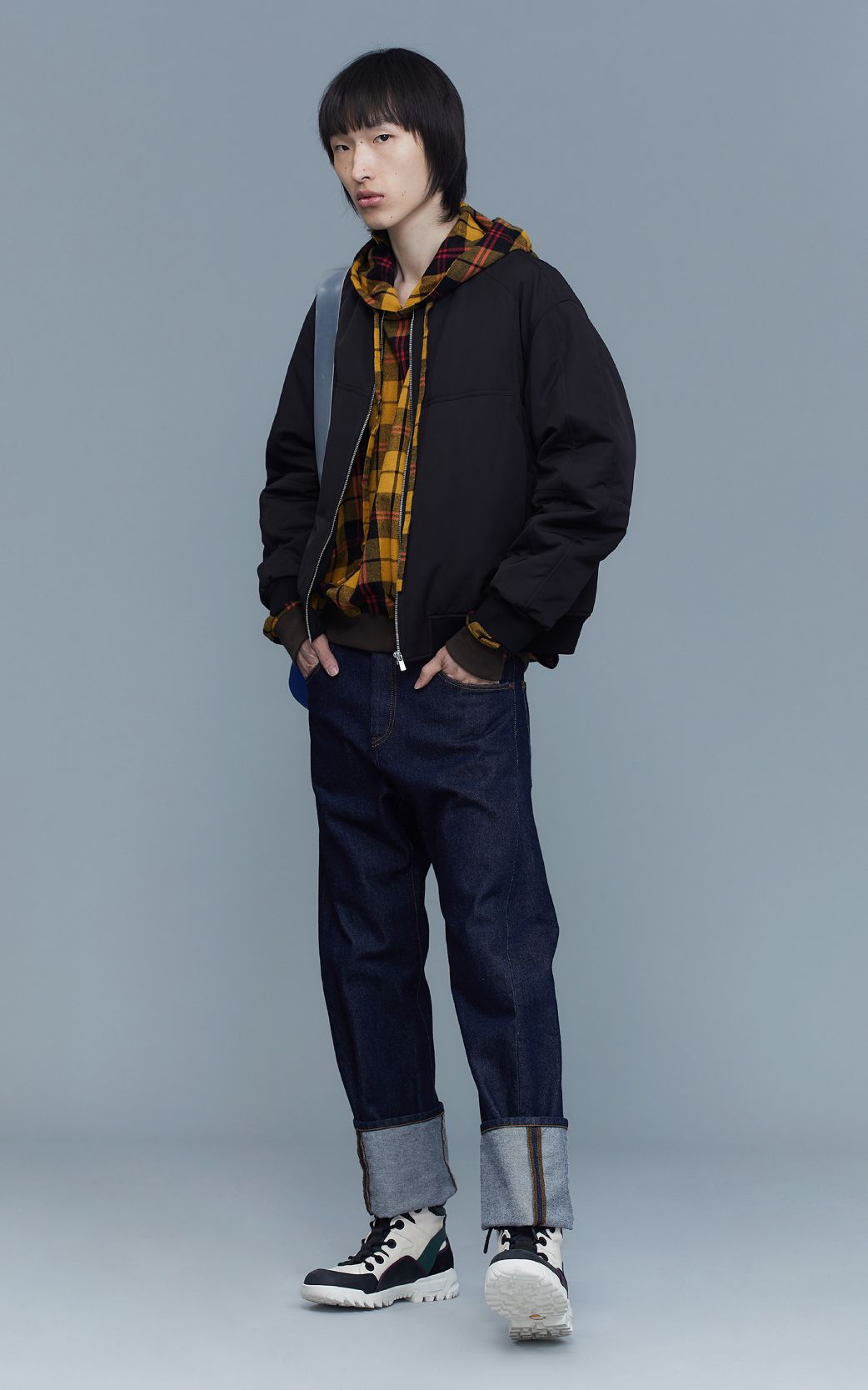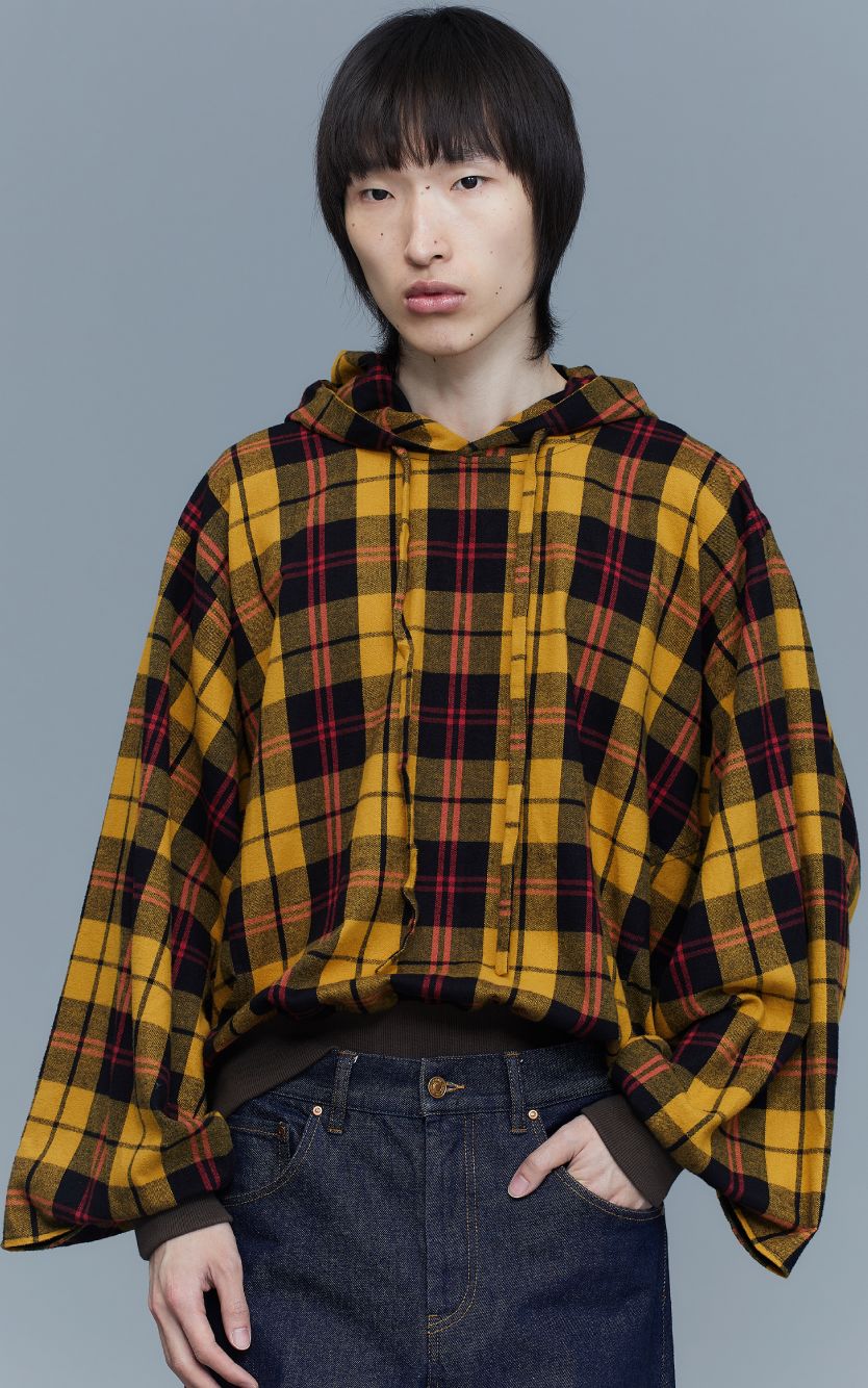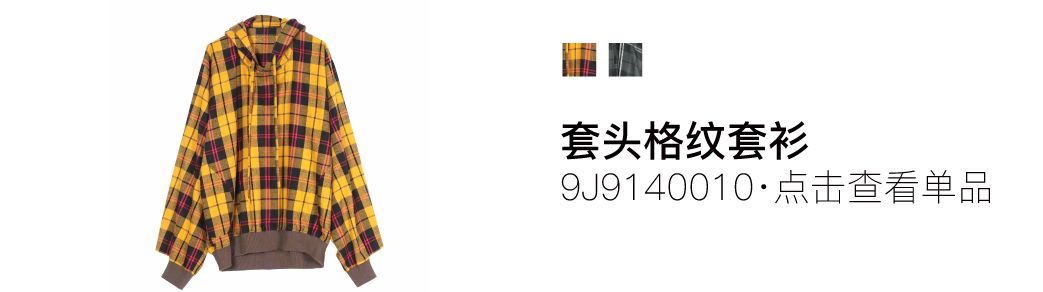 这款带帽年轻格纹套头衬衫,整体体量放宽,且在袖子处做了独特的放量设计,配上格纹,年轻时髦。双层帽子和加长帽绳设计在细节之处增加趣味。