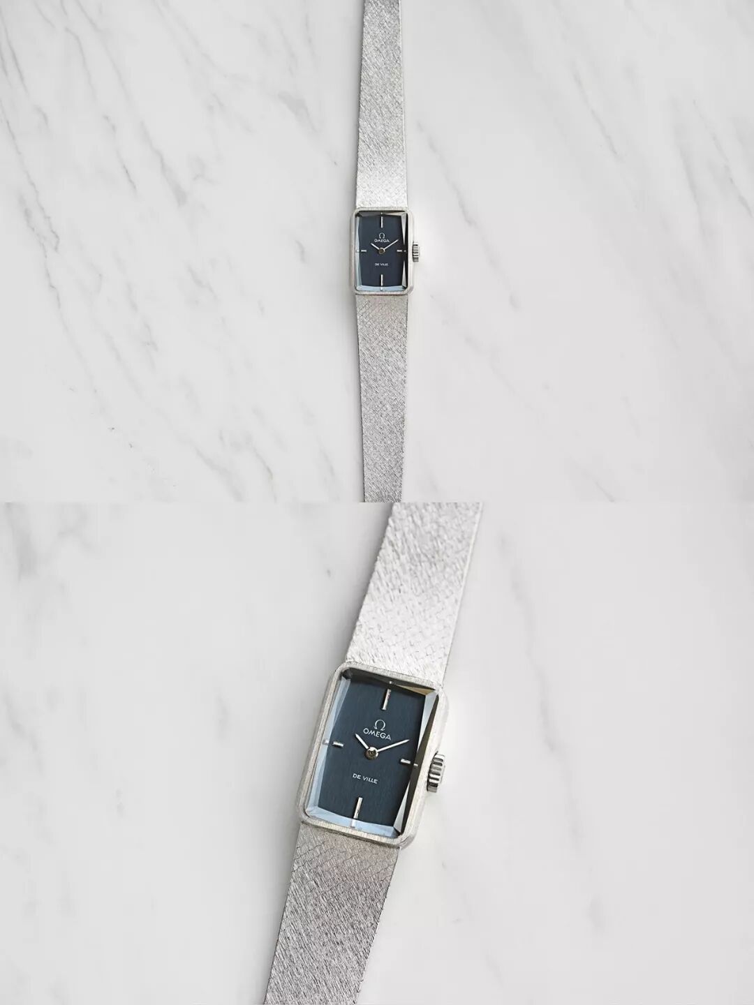 这是一枚令人惊艳的OMEGA_DE VILLE碟飞系列女士白金腕表 / 1970年瑞士生产 / 16x22mm长方形表壳与表链融为一体 / 长度160mm / 均为18K白金精心打造并手工潤饰 / 厚厚的水晶玻璃表镜切角菱形打磨折射着光 / 迷人的蓝色表盘保存完美 / 内部装载精巧的17钻手动上链485机芯 / 1960年OMEGA在设计一款海马腕表时考虑到突出典雅时尚的都市风格 / 便命名为“DE VILLE”意为“都市情调” / 1967年“DE VILLE”成为一个新的系列“碟飞”并延续至今