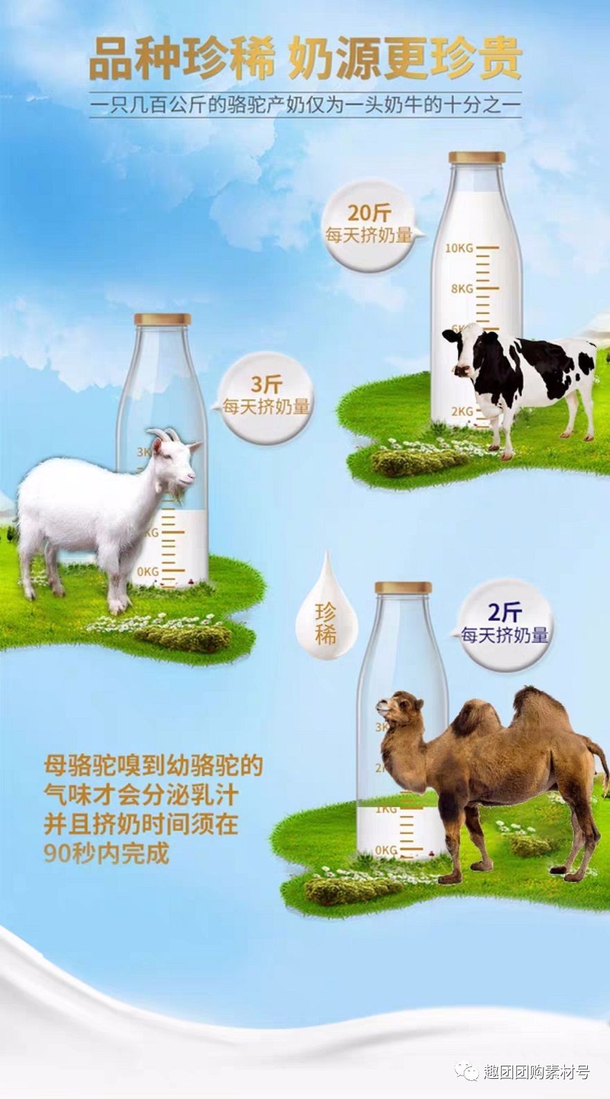 选用双驼峰骆驼,一头奶牛平均每天的产乳量是30kg,双驼峰乳量仅为2斤,产奶量更低但是营养成分含量更高,乳汁质量也更稳定,所以更加的珍贵,营养更丰富