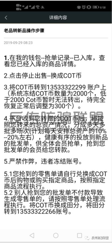 “人人做批发,省钱又赚钱”,长田云批发以这个诱人的口号和高额的利率吸引了无数人入局。而后套路又与其他众多崩盘跑路的资金盘一样,以平台被黑客攻击或其他理由为由,变换规则,将未付款的订单转换成COT虚拟币并诱导用户追加投资,而COT虚拟币无法提现,只能以人民币百分之百的转换率购买平台商城的商品。