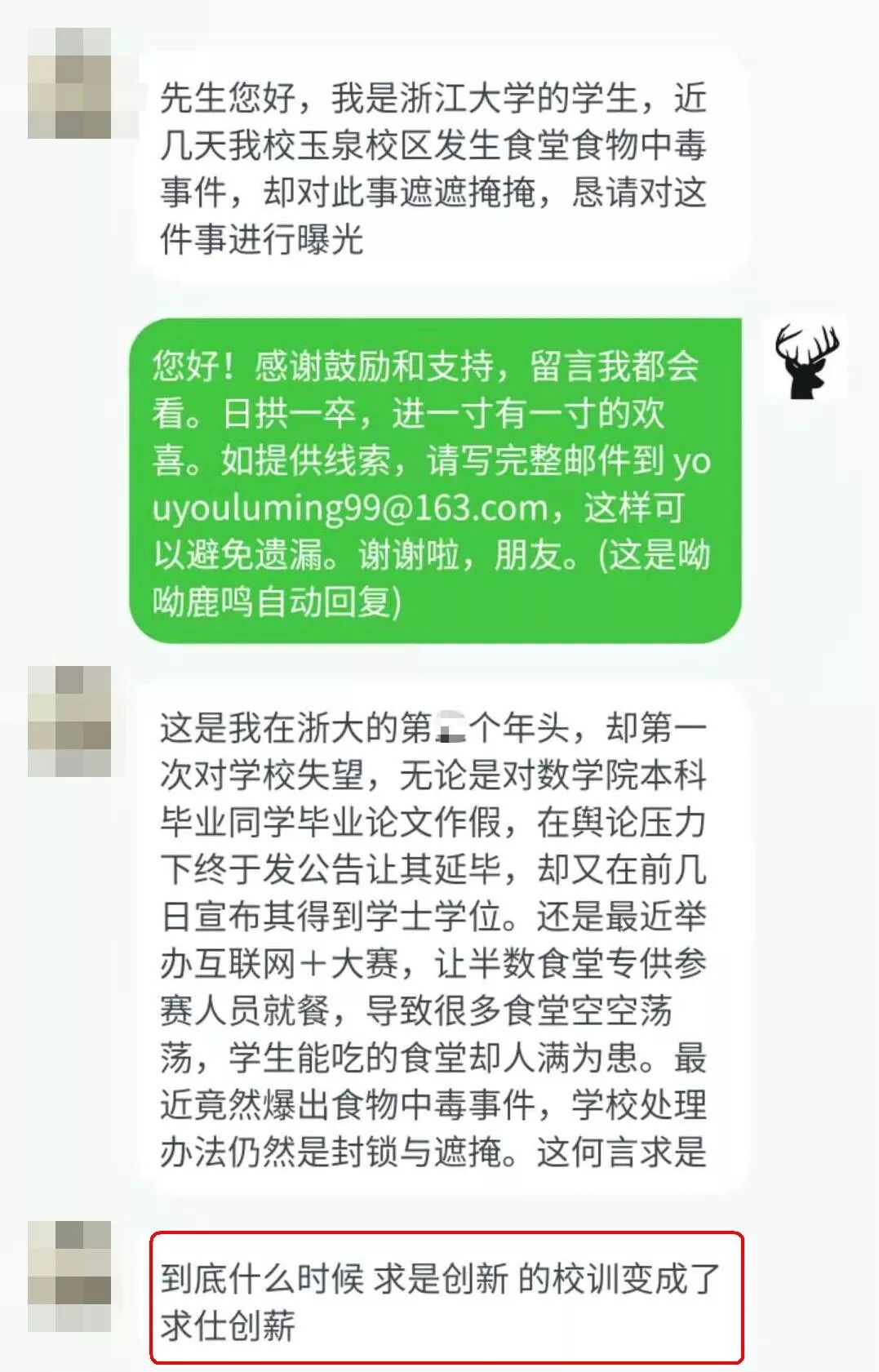 除了邮箱的来信,我还在呦呦鹿鸣公众号的后台接到了几位浙江大学学生的留言,其中有一位,不仅关心自己,还担心其他大学的学生: