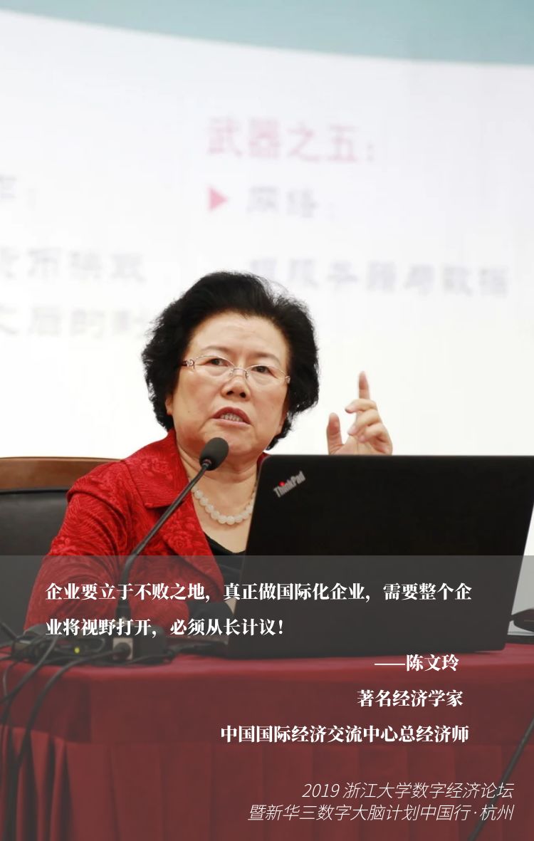 10月19日下午,在由浙江大学与紫光旗下新华三集团联合主办、浙江大学管理学院具体承办的“数字领航 智绘未来”2019浙江大学数字经济论坛暨新华三数字大脑计划中国行·杭州站活动上著名经济学家、研究员、博士生导师、中国国际经济交流中心总经济师、国务院研究室原司长陈文玲女士围绕“当前国际经济形势与中美关系”这一主题,通过分析美国六大收割世界财富的工具,深入浅出地引出中美关系的背景与实质,以其所见所闻所读所思,列举了美国收割世界财富的种种途径和大量现实案例,深度研判当前国际经济形势和中美关系。