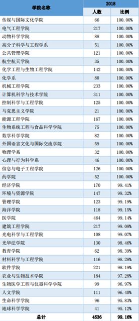 可以看到,浙江大学的硕士毕业生就业单位遍布各行各业,就业人数最多的前十一名中,有目前我国比较大的互联网科技类公司,如华为、网易、阿里巴巴、腾讯等,也有重要的国企、高校、医院,如国家电网、浙江大学、附属医院等。尤其是华为,2018年,华为技术有限公司与浙江大学工程师学院签署校企合作框架协议,带动了更多学生毕业后到华为就业。 表四:2018年各院系硕士毕业生就业率