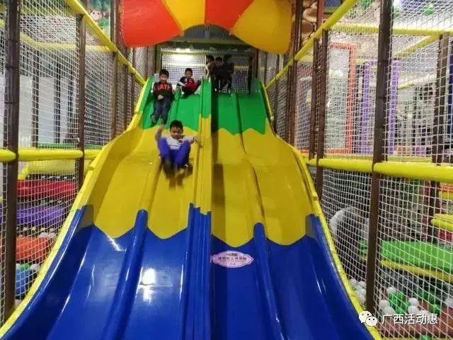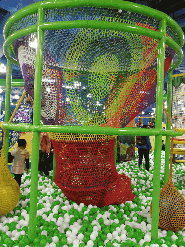 乐园内设有彩虹大滑梯、螺旋滑梯、滚轴滑梯、波浪滑梯从旁边的七彩步梯,登上由青、黄、蓝三种颜色构成的四条彩色滑梯再纵情向下方的海洋球池,感受速度带来的刺激体验