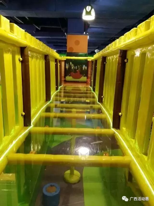 两边亮着彩灯的玻璃栈道呈现在眼前鼓起勇气渡过玻璃栈道再从滚轴滑梯滑下来,这感觉棒极了!