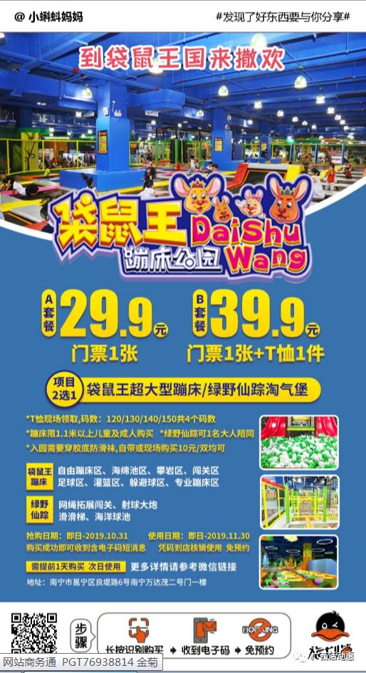 A套餐现仅29.9元=门票1张B套餐现仅39.9元=门票1张+袋鼠王T恤1件性价比高到尖叫~再不来玩就亏啦~ 【南宁】袋鼠王蹦床公园门票抢购