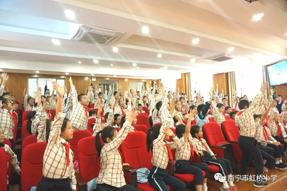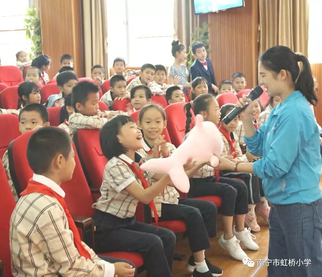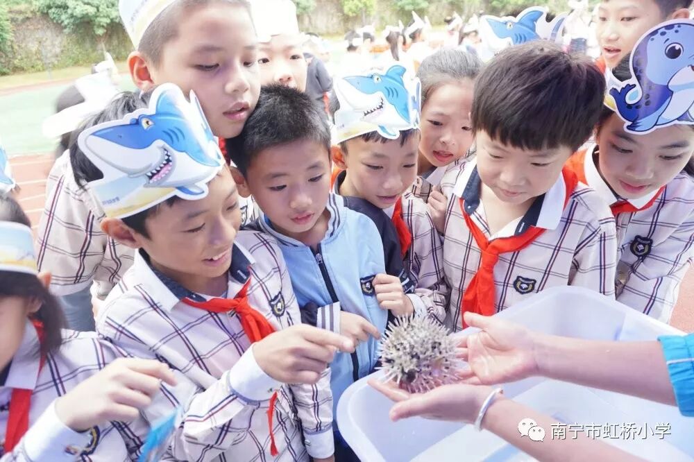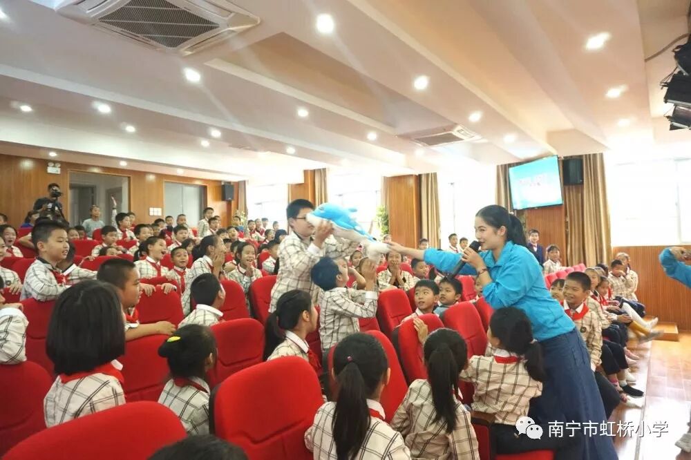 同时,广西壮族自治区自然博物馆给孩子们带来恐龙知识讲座以及南宁市海底世界的工作人员带来知识讲解也精彩非凡,引得孩子们呼声不断。在一个小时的时间里,孩子们不仅收获了很多关于恐龙与中华鲎的新知识,还与可爱的讲解员展开互动,虹桥学子的精彩提问获得在场讲解员的一致好评。