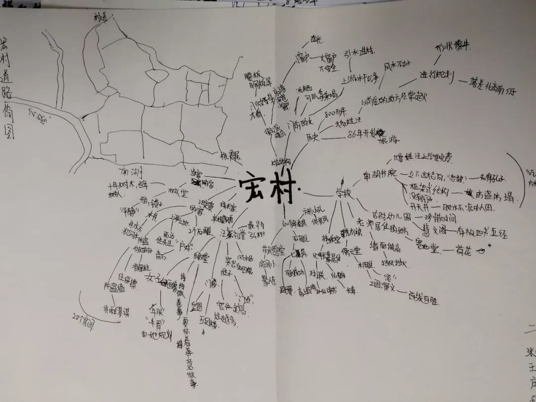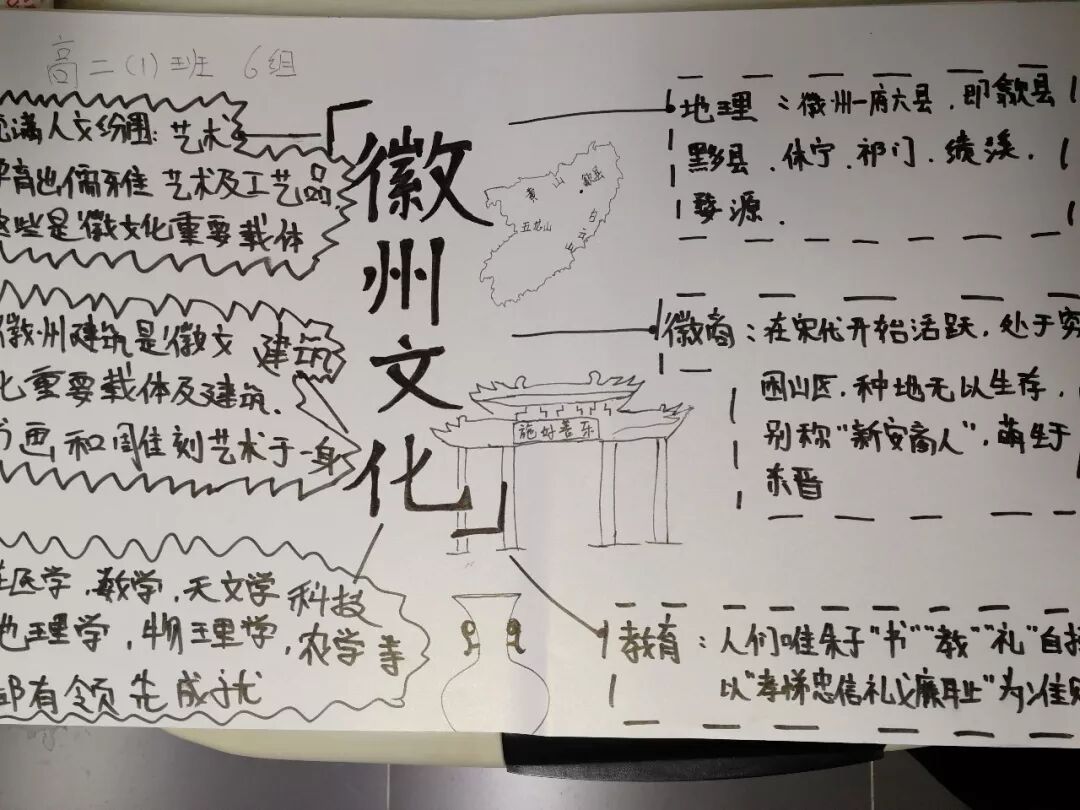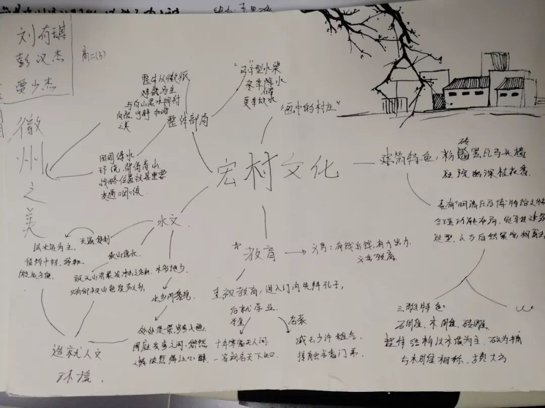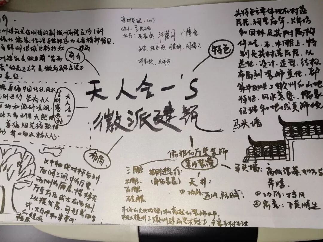 凭借清晰的结构化思路以及简洁的风格,思维导图逐渐成为学习中必不可少的一个好方法。它以最直观的方式反映了我们的思考过程,让我们更高效的吸收、理解和转化我们的所见所闻所感。在徽州文化博物馆、渔梁坝和徽州古城,同学们都分小组绘制了思维导图。在这个过程中,每个小组有不同的分工:绘画、构思、落笔......大家真正记下对徽文化不同方面的理解和认识,对徽州人民的智慧、徽派文化的广博与深邃心生敬佩之情。