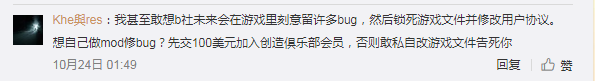“我甚至敢想b社未来会在游戏里刻意留许多bug,然后锁死游戏文件并修改用户协议。想自己做mod修bug?先交100美元加入创造俱乐部会员,否则敢私自改游戏文件告死你”
