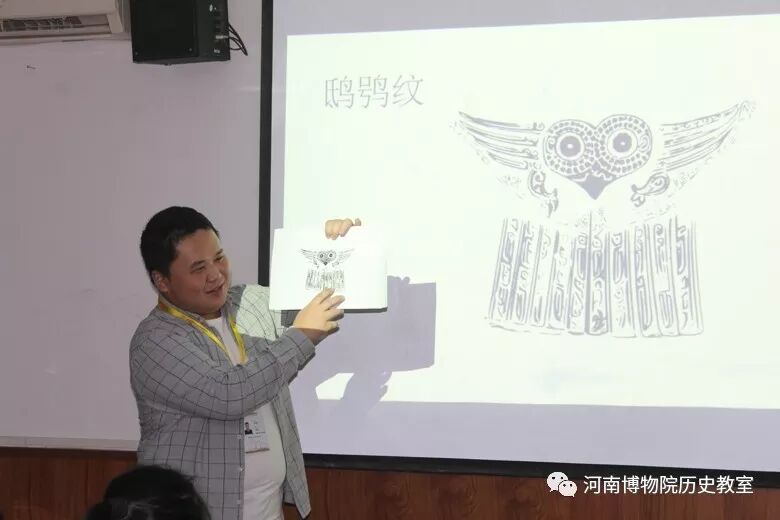 10月25号上午,二七区培育小学的历史教室里座无虚席,120多位师生迎来了宣讲团的第一讲——《中原鼎故事》。虽然是历史教室的合作单位,但能如此零距离的与河南博物院亲密接触还是头一回。于是,宣讲团的老师先是给同学们普及了河南博物院的基本情况,讲述了中原历史文化宣讲团作为河南博物院的重要教育品牌,通过普及中原历史文化、红色故事以及爱国主义教育等内容受到众多大学、中小学、社区、部队等单位的喜爱。紧接着,主讲人刘焱老师以幽默、活泼的方式,让学生们认识了鼎的作用、西周的用鼎制度以及常见的青铜鼎纹饰,中间穿插“问鼎中原”的成语故事以及各种不同与鼎相关的成语,多次激发起学生们的兴趣与热情。最后“纹饰蹲”的游戏把宣讲活动推上了高潮,“错了,你不是兽面纹,你是鸱鸮纹!老师,老师,他也错了,应该喊火纹蹲!还是饕餮纹最厉害。。。。。。”