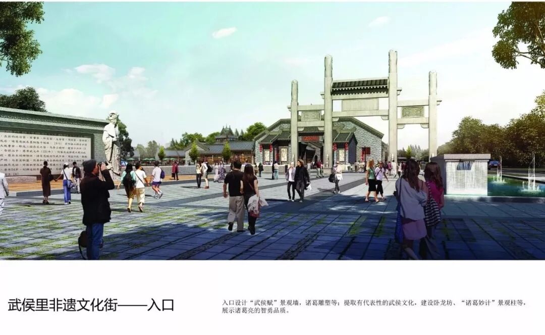 入口设计“武侯赋”景观墙,诸葛雕塑等。空城计戏台通过诸葛亮智谋的历史典故,突出展示纪念诸葛之“智”。