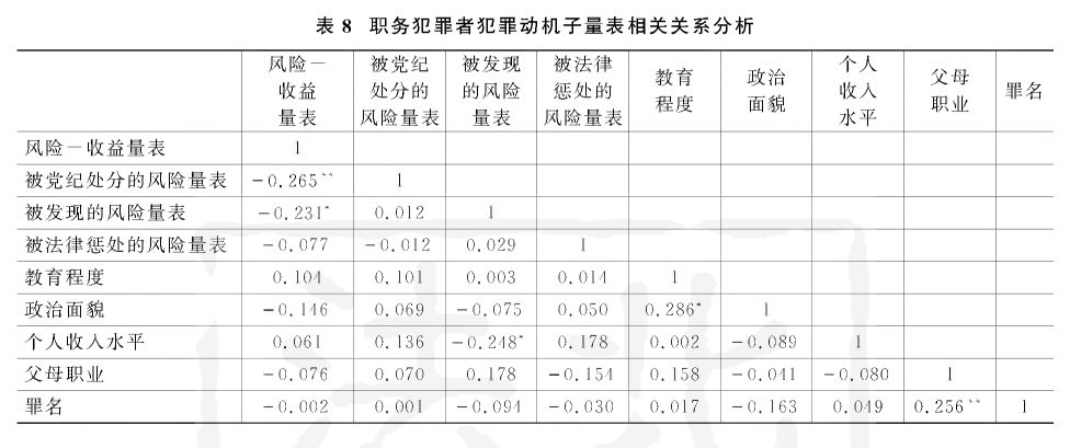 进一步,本研究又在上述四个子量表的基础上进行了相关关系检验(见表8)。结果表明,被党纪处分的风险量表与风险收益量表呈现较为显著的负相关,这实际反映出在中国情境下,对腐败行为的理解不能仅着眼于职务犯罪,还要考虑党纪处罚。在“党管干部”原则之下,基层公务员的晋升取决于党组织的考察与决定。因此,现实中,虽然受访者都是正在服刑的职务犯罪者,但他们对于党纪的考量仍然是很看重的。同时,我们也发现,个人收入水平与被发现的风险量表也呈现较为显著的负相关。这反映在现实中就是,越来越多的腐败行为呈现愈加明显的隐蔽性。换言之,犯罪者从事腐败行为不仅仅是简单的现金交易,而是依靠身份、地位等隐性资源进行交易。因此,这类对象实际收入很高,但由于隐蔽性强反而很难被发觉。