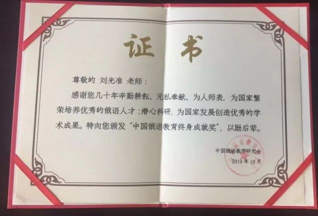 “中国俄语教育终身成就奖”和“中国俄语教育杰出贡献奖”由中国俄语教学研究会于2016年设立,每三年评选一次,用于表彰为中国俄语教育事业耕耘工作五十年以上的前辈学者。在全国各高校提名的诸多候选人中,共有包括刘光准教授在内的10名专家获得“中国俄语教育终身成就奖”的殊荣,另有17位专家获得“中国俄语教育杰出贡献奖”。