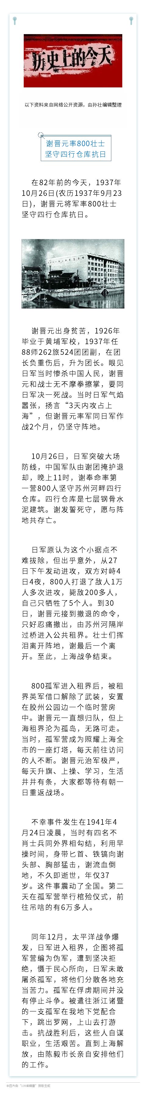 历史上的今天, 谢晋元将军率800壮士坚守四行仓库抗日