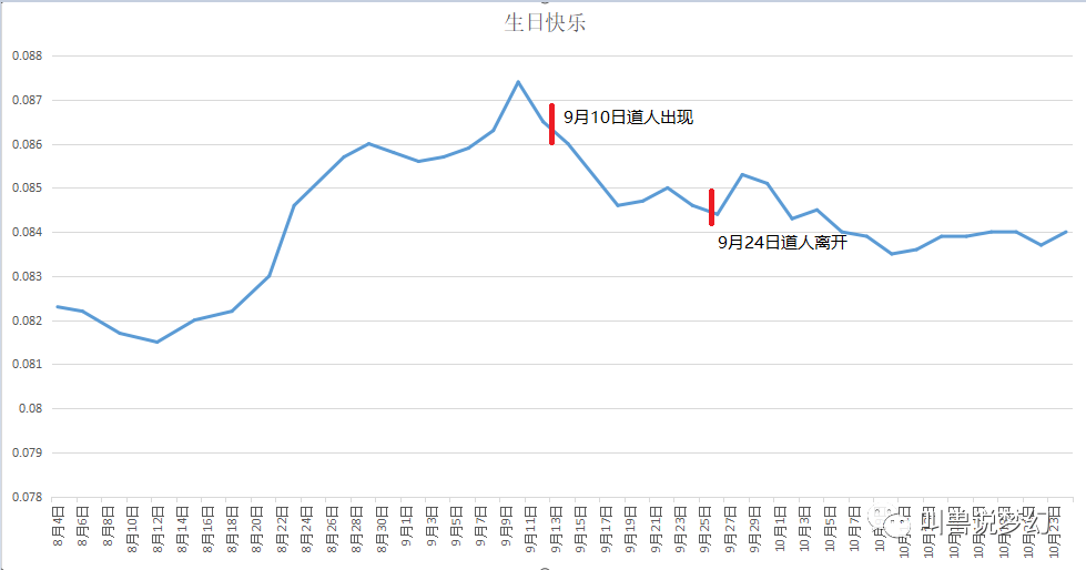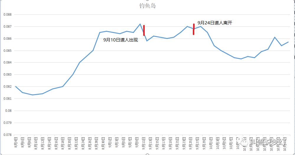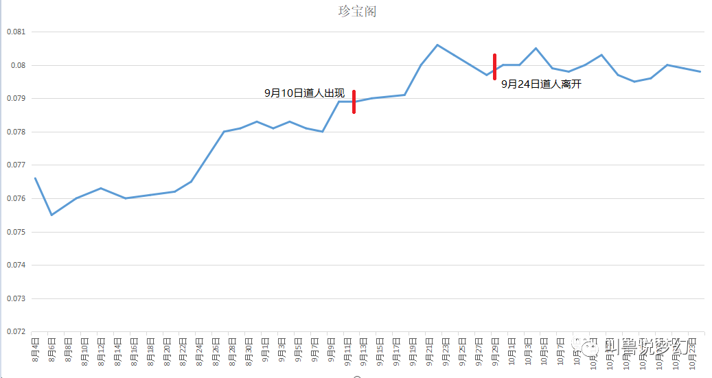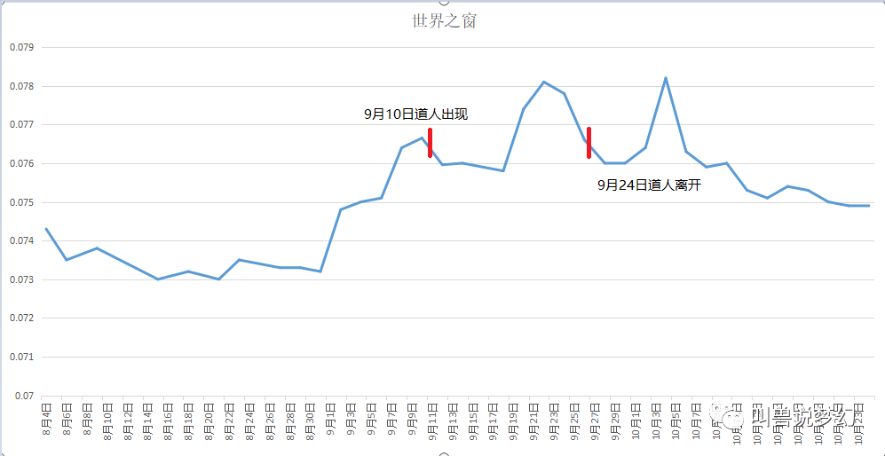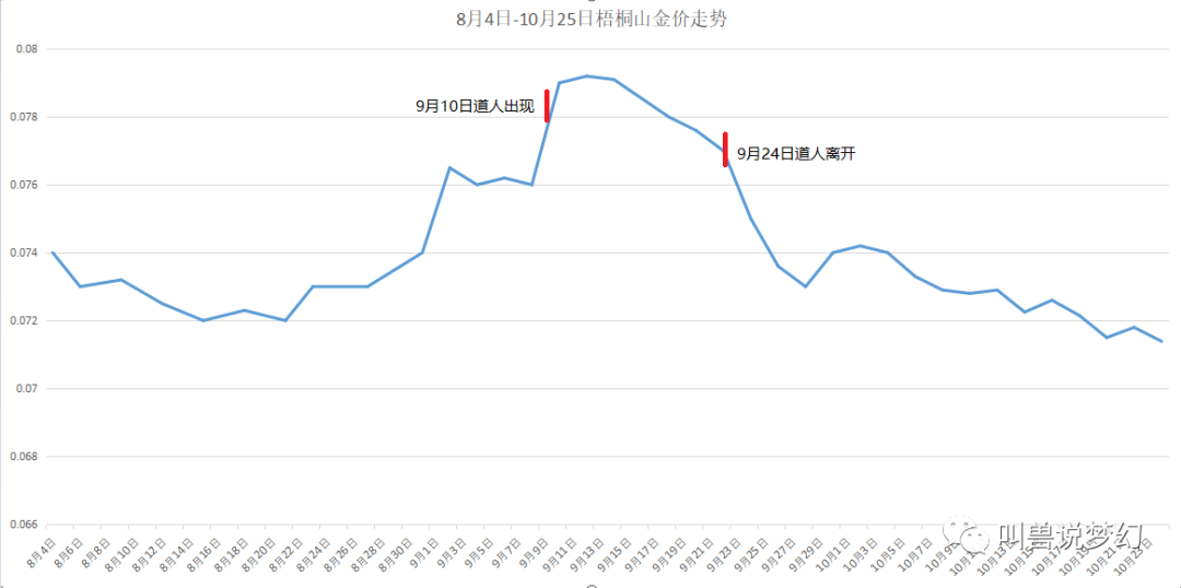 叫兽记录的九组服务器分别是:梧桐山,生日快乐,2008,世界之窗,珍宝阁,兰亭序,青花瓷,钓鱼岛,龙马精神,并且在9月份道人出现和道人消失的时间点叫兽分别用红线标注,很直观的展示了道人对于金价的影响。至今道人已经离开了一个月,当前的金价形势如何呢?