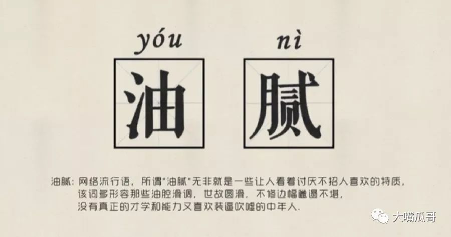 “油腻”主要是形容那些油腔滑调、世故圆滑、不修边幅邋里邋遢,同时能力不足又喜欢装X吹嘘的中年人。