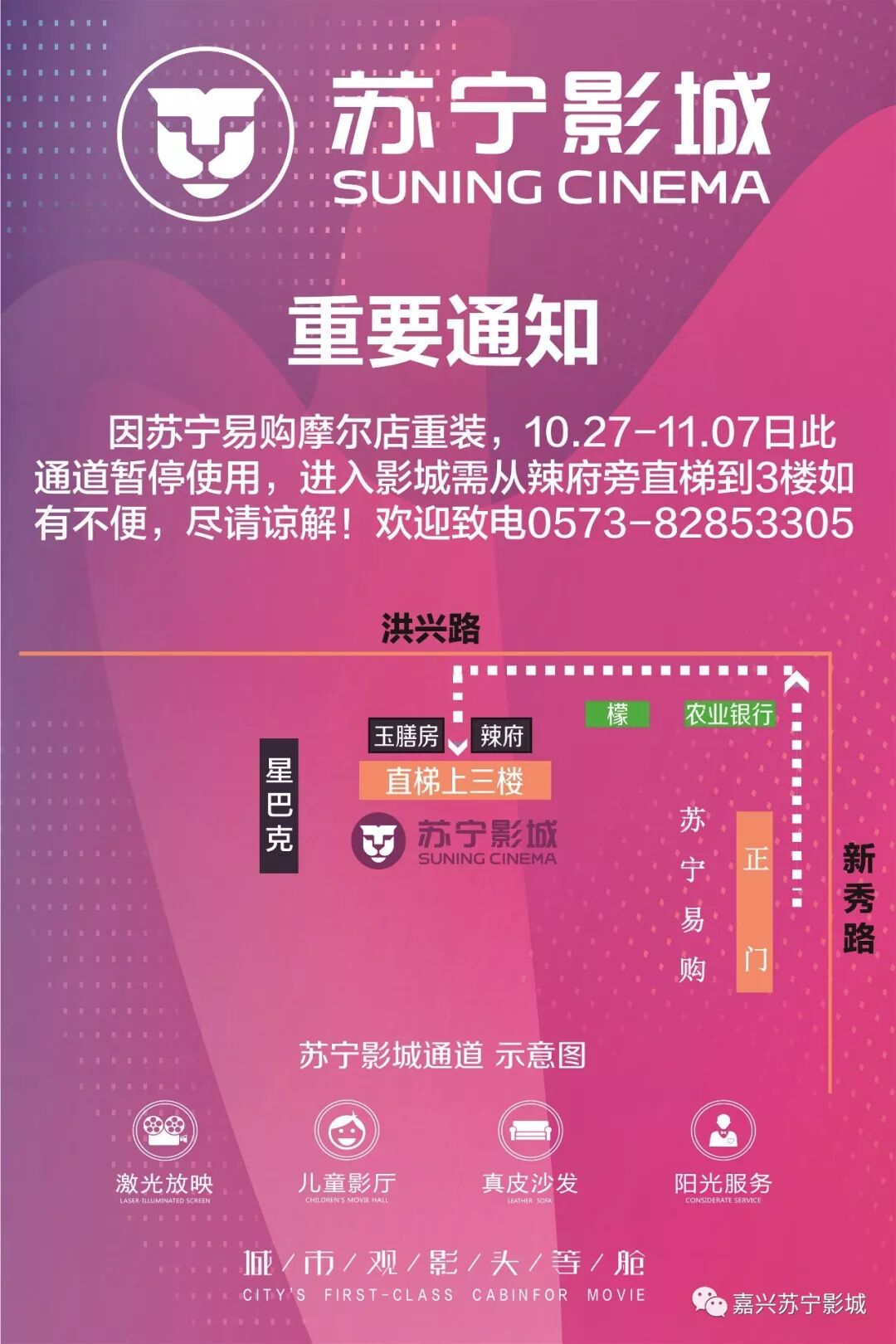 因苏宁易购摩尔店重装,10.27-11.07日原从易购店进入到3楼影城的通道暂停使用,现需从辣府旁的直梯到3楼,如有不便,尽请谅解!欢迎致电0573-82853305!
