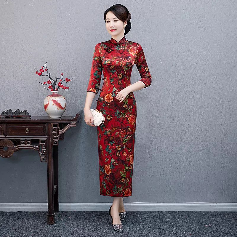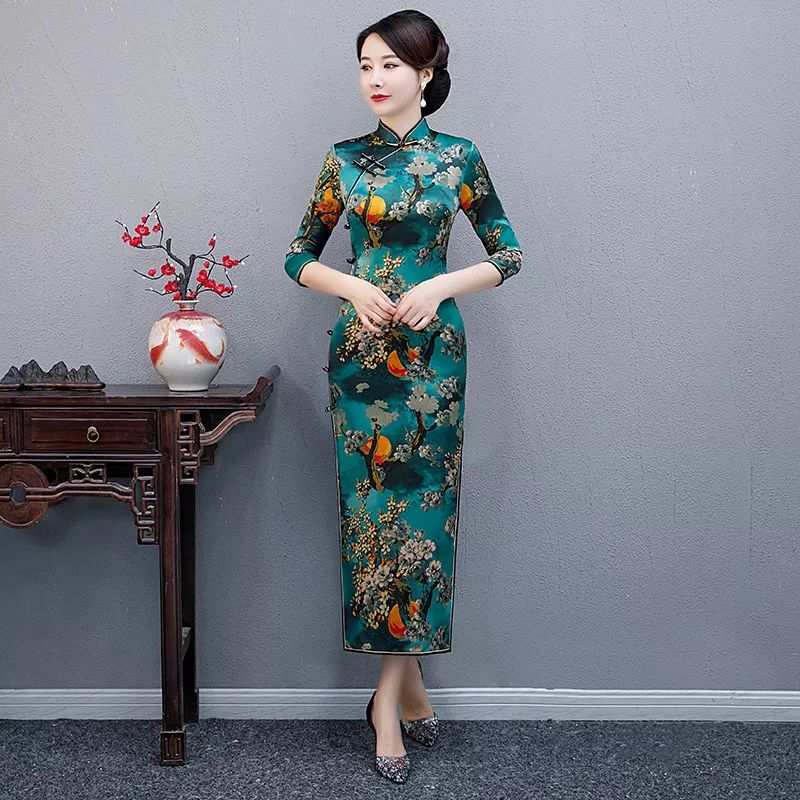 WX-1930秋冬新款改良真丝长款旗袍日常气质连衣裙修身婚宴七分袖旗袍