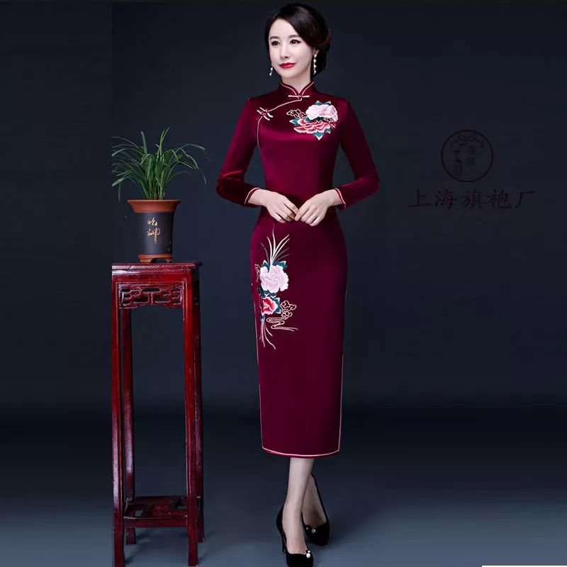 上海旗袍厂LHS-L9101酒红色绣花长款旗袍婚宴婚礼喜宴喜婆婆婚宴服长款长袖冬季