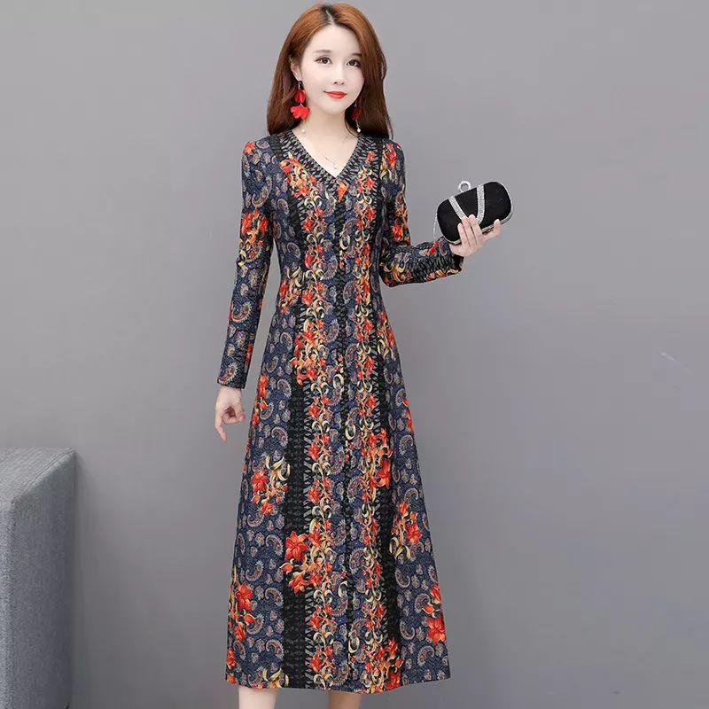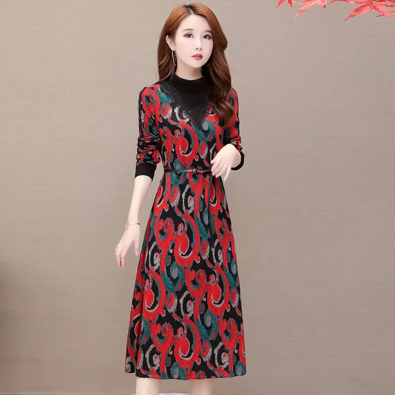 YWE-YDY-YB9940秋新款韩版修身显瘦加厚气质印花连衣裙女中长款长袖高领收腰