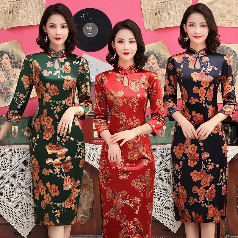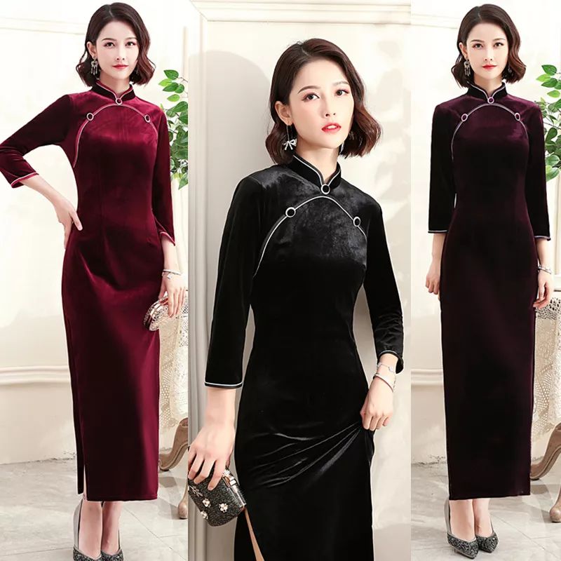 GX时尚改良女士大码长款丝绒七分袖旗袍2019秋冬新款日常旗袍