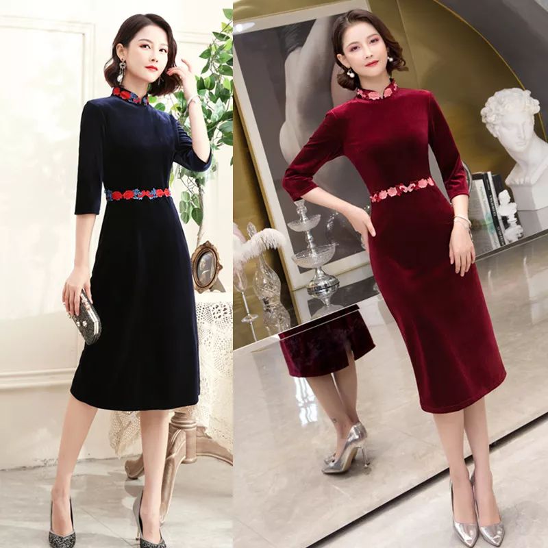 GX时尚改良中长款中袖大码丝绒旗袍2019冬季新款旗袍裙