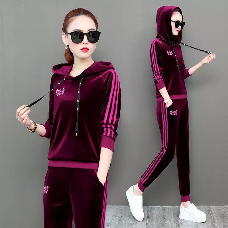 GZSH-213870Y9539秋新款连帽长袖休闲运动服绣花金丝绒套装两件套