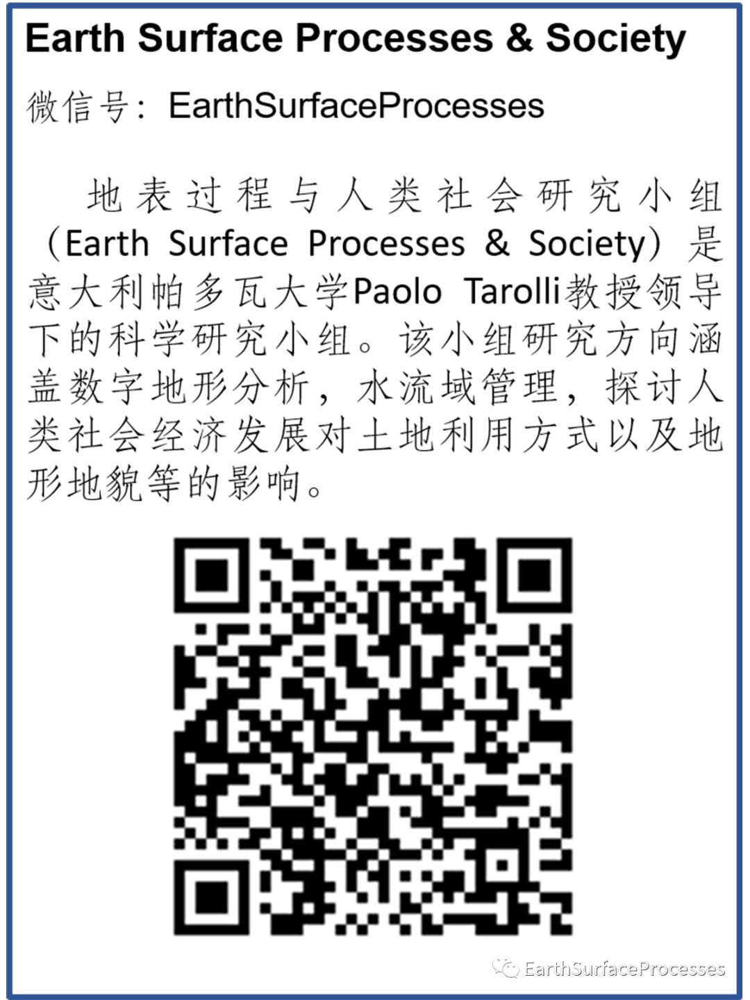 保罗教授简介:Paolo Tarolli,水资源管理和综合流域管理领域教授,博士生导师,意大利帕多瓦大学地球表面过程和社会研究小组负责人。2006年获环境流域管理和地理学博士学位,自2011年以来一直在帕多瓦大学从事学术研究,主要研究领域有数字地形分析、地表过程分析、自然灾害、地貌学、水力地貌学、激光雷达和运动结构摄影测量方面,从局部到区域尺度分析人类活动的地形特征等。Paolo教授还担任欧洲地球科学联盟自然灾害司副主席、意大利农业工程协会副主席(信息和通信技术),同时也是自然灾害和地球系统科学(NHESS)执行编辑、遥感(Remote Sensing)和土地退化与发展(Land Degradation and Development)等期刊的副编辑。截至目前,他已在一系列国际级学术刊物发表论文论著100余篇,并应邀在诸多国际研究机构、外国学术机构(如:普林斯顿大学、洛桑联邦理工学院、巴黎高科农业学院、国立成功大学、中国地质大学(北京)、大连理工大学)和国际会议(IGC, AAG, ISPRS, RGS-IBG, AOGS-AGU, 中国土壤科学学会)上进行了20多次演讲。