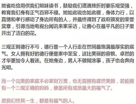 孩子的成长过程中,最重要的教育方式就是家庭教育,好的家庭教育可以影响孩子的一生。父母是孩子一生的老师,每一个孩子的成长都离不开父母的引导和教育,只有正确的家庭教育,父母有优秀的教育观念,孩子的成长才会更优秀。很多时候,一个家庭,母亲往往比父亲更重要,母亲,是子女最重要的三观源泉,决定着家庭成员的层次和幸福。