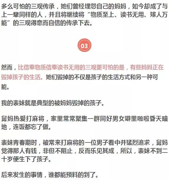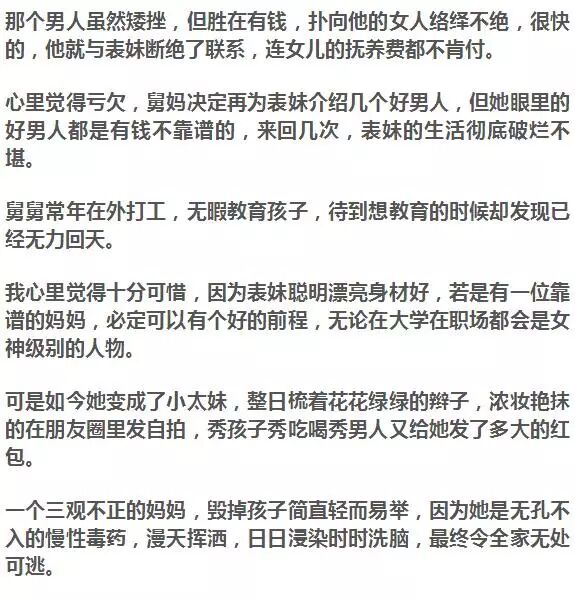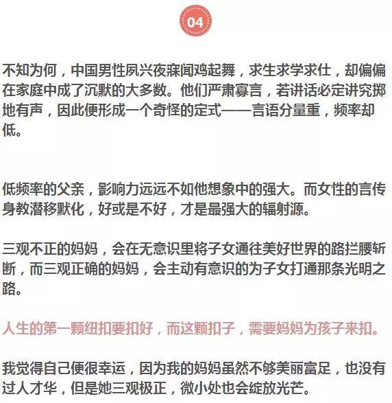 作为一名资深教育者,家长们喜欢在微信上和我交流孩子的学习和教育问题,我也接触过不少家长和孩子。很多优秀的孩子在成长的过程中都离不开父母的引导与教育,优秀的孩子背后肯定有优秀的父母,只有父母正确的家庭教育方式才能促进孩子的成长。而如今,很多家庭教育孩子的重任都在母亲身上,父亲主要负责挣钱养家,虽然说好的家庭教育离不开父母双方的配合,但是目前的阶段,显然母亲更重要,母亲一定要有正确的三观,注重自身的家庭教育方式和言行举止对孩子的影响。