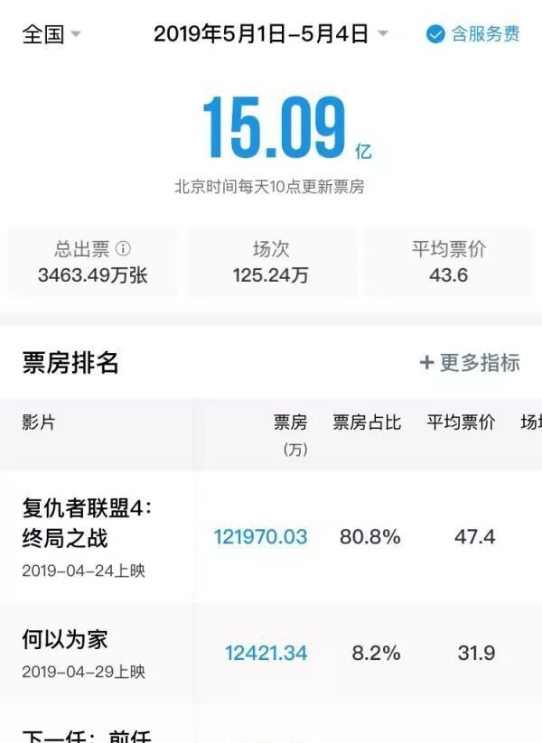 此外,据淘票票专业版显示,《复联4》的平均票价47.3元也远高于其他的影片,五一期间不少大城市影院IMAX厅的售价依然保持在300元以上的高位,也依然没有挡住影迷们的观影热情。