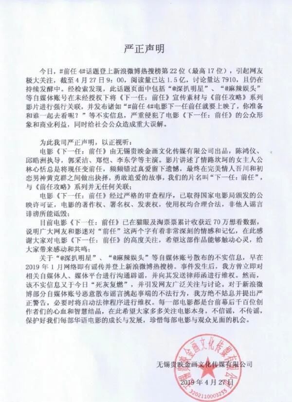 “电影下一任前任官微”于4月27日发布了关于电影《下一任:前任》不是“前任4”的声明