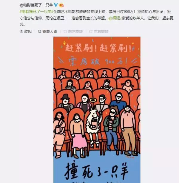 5月3日,电影《撞死了一只羊》在票房突破900万之后,发微博致谢