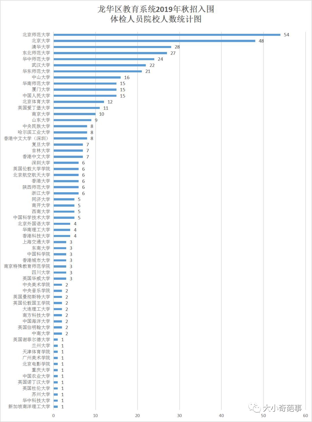 据“每日经济新闻”10月22日报道,近日,深圳市龙华区教育系统2019年秋季校园招聘收官。昨天(10月21日)龙华教育公布了这次招聘的结果。此次招聘吸引海内外超3.5万名应届毕业生报考,经过层层选拔,最终来自全球62所院校的491名青年才俊脱颖而出入围体检,成为准龙华教育人。