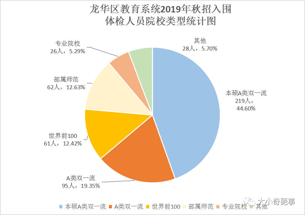 根据龙华教育,在入围体检的491名毕业生中,A类双一流院校314人、部属师范62人、世界排名前100高校61人,占比89%,另有中央美术学院等专业院校26人。其中:博士23人,来自北京大学6人、清华大学5人;研究生及以上学历423人,占比86.2%。值得一提的是,本硕均就读于A类双一流院校的毕业生多达219人,占比近45%。