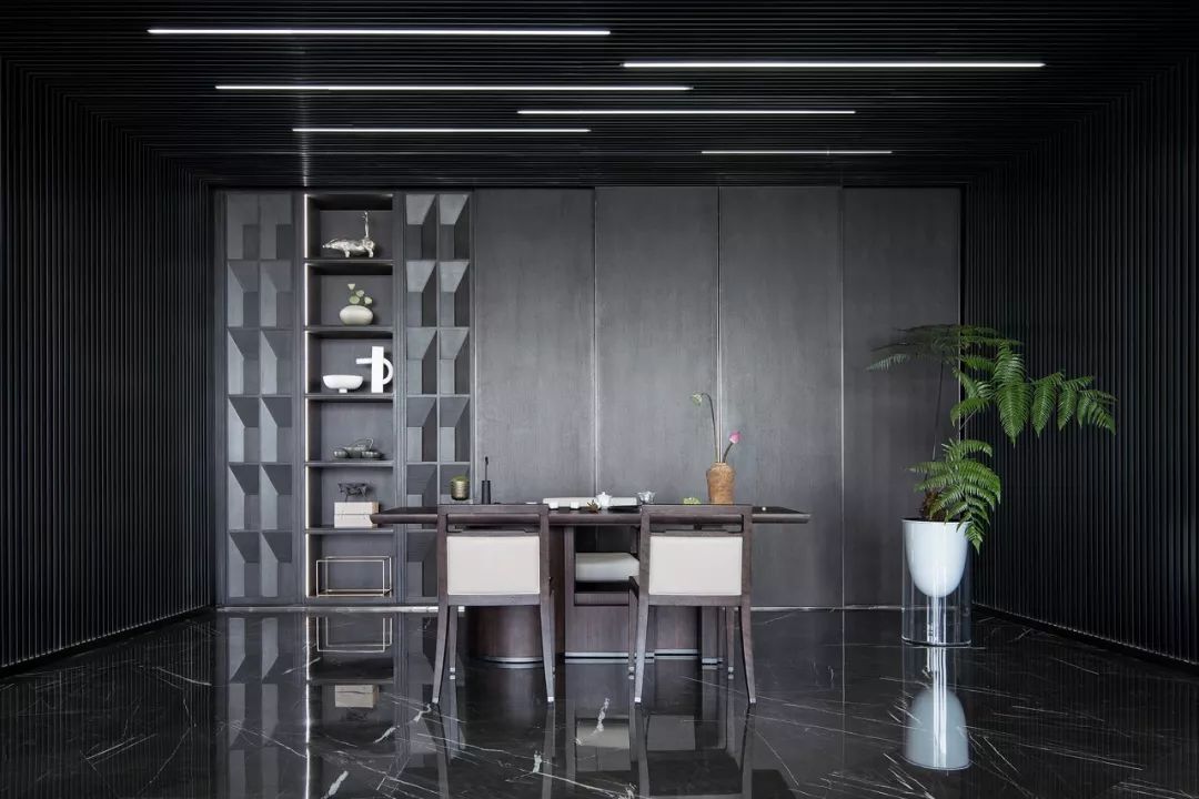 茶室的天花板与墙面模糊了边界,形成一个独立的空间体。石材上的茶桌倒影像平静的海面--平和悠然,以茶会友,诠释品赏茶的美感之道。